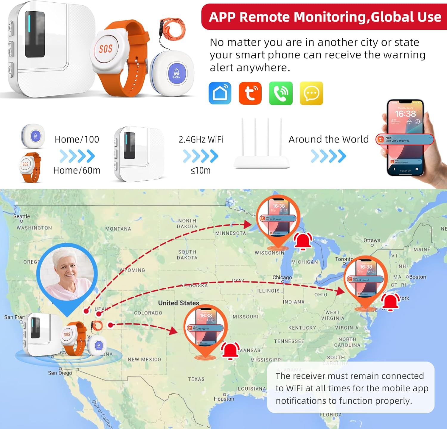 The receiver connects to 2.4G WiFi (not 5G) for instant global app notifications when the call button is pressed. Choose from 20 ringtones, 5 volume levels, and customize button names to know exactly who needs help.
