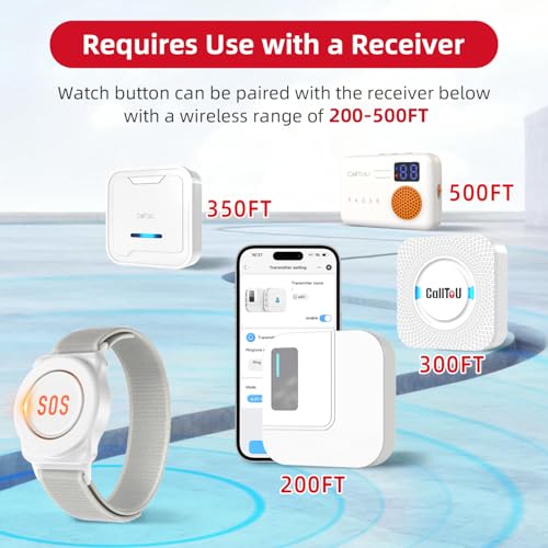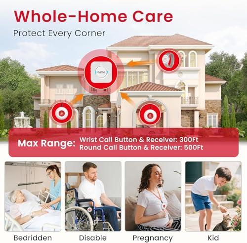 PORTABLE CAREGIVER PAGER: Call bell system with 1 wrist button, 1 waterproof call button and 1 portable vibrating receiver. The call buttons can be worn on a neck/wrist or fixed on a wall so caregivers can be alerted from anywhere.