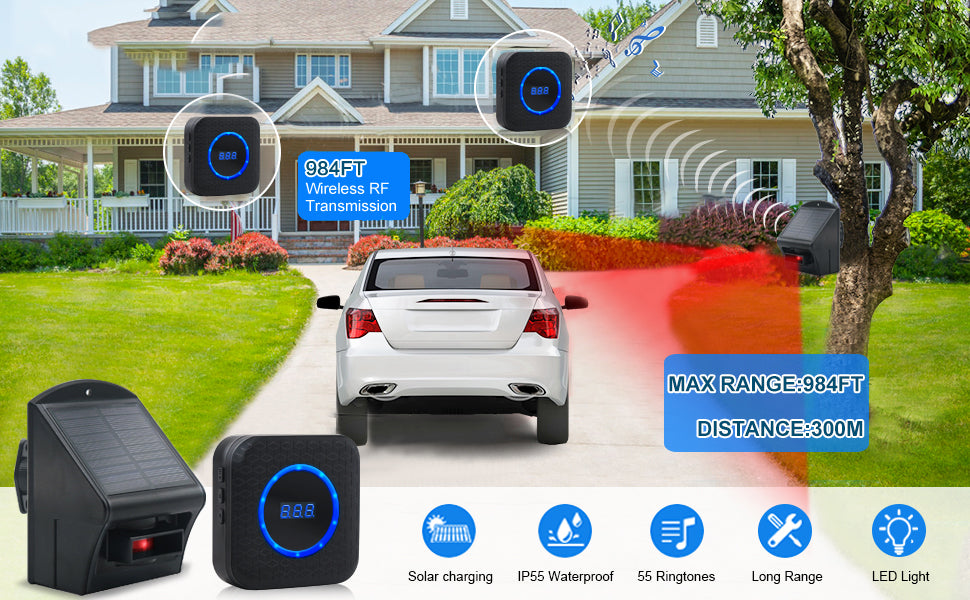• ☀【Easy Installation & Weatherproof】The solar wireless alarm adopts IP55 waterproof and screw installation. It can be installed outdoors or indoors with plenty of sunlight. Suitable for all-weather outdoor. Just plug the receiver into the socket at home.